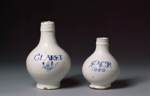 of slight pear shape with a small plain footrim, the slender strap handle with a simple pointed lower terminal, inscribed in blue 'CLARET 1645' above a curlicue, 16.2cm., (some wear to the glaze on the rim and foot, minor glaze hairlines)